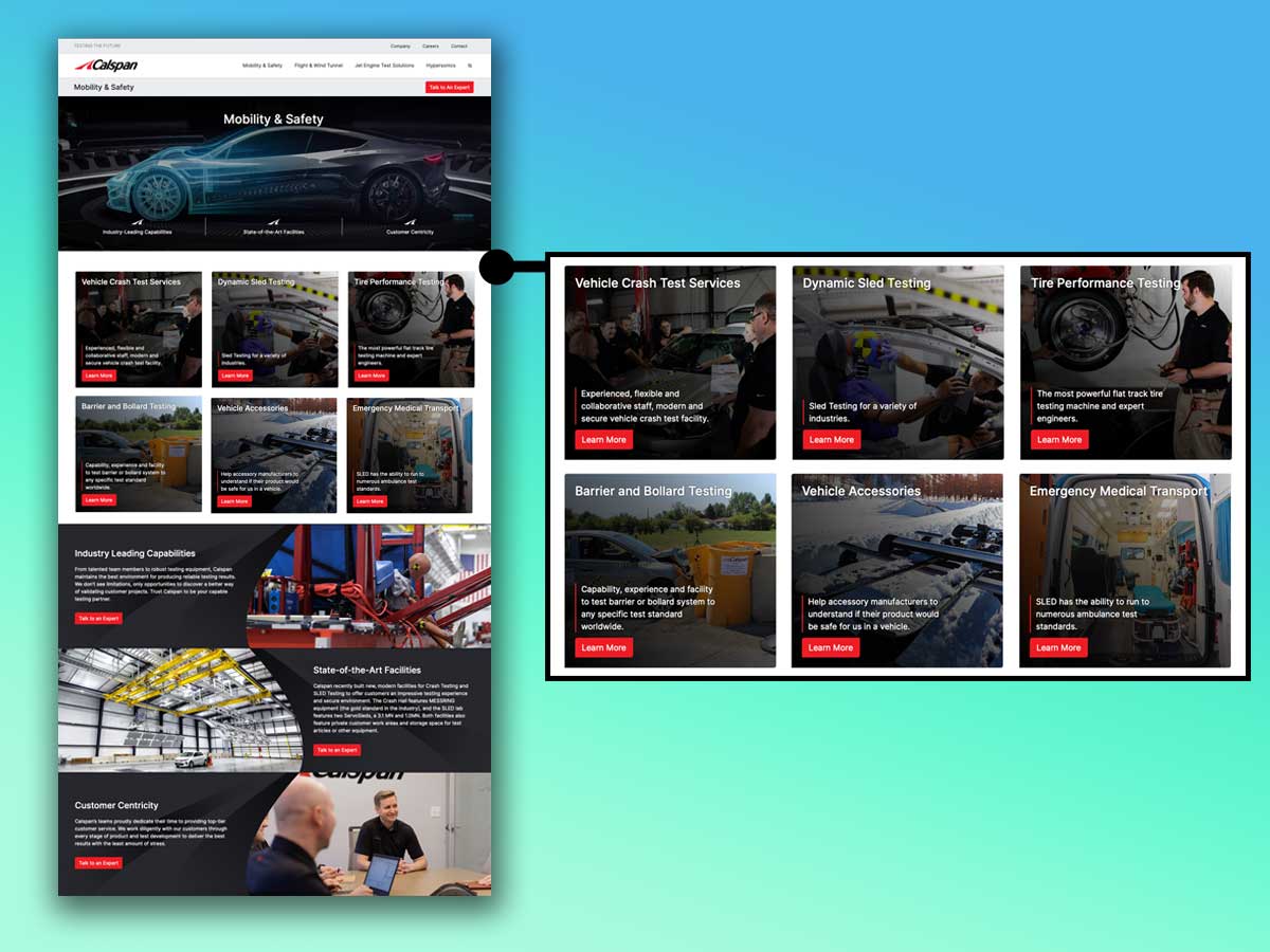 On the official Calspan site, I was responsible for designing & developing a card layout that would be used across the site. Using Bootstrap and my HTML & CSS skills, I developed a card structure that is both user friendly and responsive.