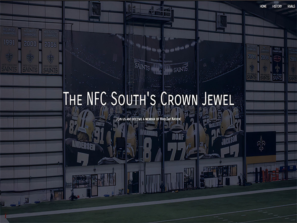 This is a site that has been created in order to show my dedication to the New Orleans Saints Football team. On the home page, you will be greeted with a title and a little bit of text underneath it welcoming you to the site. The background image of the homepage represents the inside of the Saints training facility, located in Metairie, Louisiana. As you scroll down the page, you will notice three squares that are placed, underneath a title of "Our Values". This section, and these cards, are meant to represent the values that all members of the team and staff are expected to represent everyday. Under the values section, we have a "Key Players" section that lists three players for the team that have a large impact on the teams success. The players listed are running back Alvin Kamara, wide receiver Chris Olave, and cornerback Marshon Lattimore. The final section on the home page is used as a location to share quotes from coaches on the team.