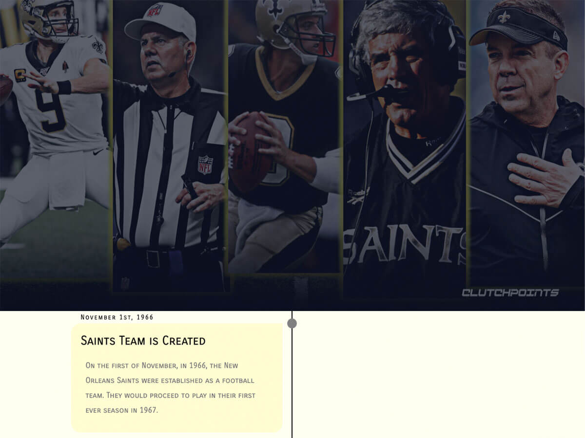 The second page of the website is all about the history of the New Orleans Saints. The website is structured in a timeline format, where the inception of the team in 1966 is located at the top of the page. As you start scrolling down the page, you will notice other cards that include special days in Saints history and the date that they happened on. The timeline ends with the final card highlighting the most important day in Saints history, February 17th, 2010, the day they hoisted the Lombardi trophy.