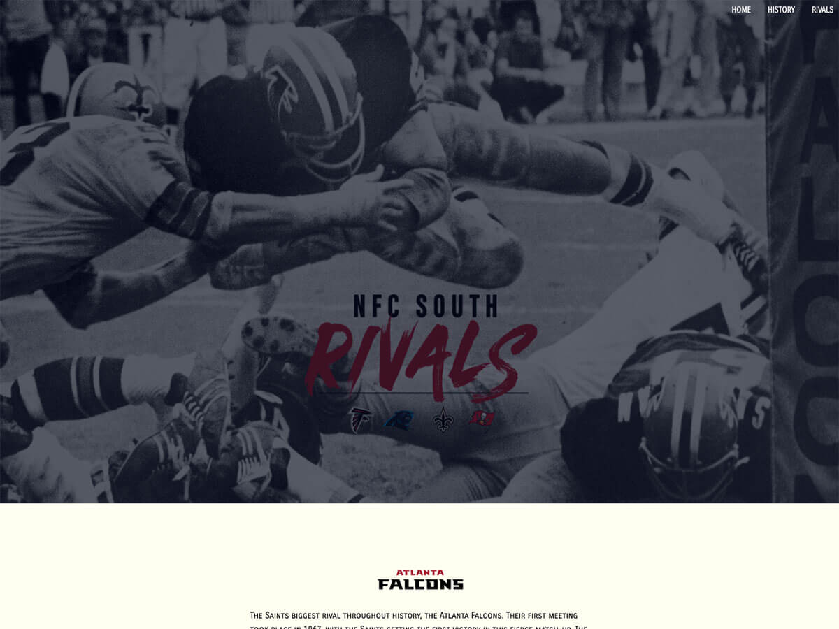 The third and final page of the website is dedicated to the rivals of the Saints. On this page, the three division rivals to the Saints (Falcons, Panthers and Buccaneers) are listed, alongside a brief description of the history between them. Also included in the description is the current series head-to-head between the Saints and each of their rivals.